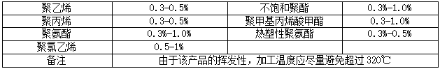 揮發(fā)度(TGA,20℃/min 在空氣中):240℃時(shí)重量損失為35.2%. 但加入 過(guò)程的揮發(fā)性取決于在材料中的溶解度、加工及設(shè)備參數(shù)等,因此相對(duì)比較低。